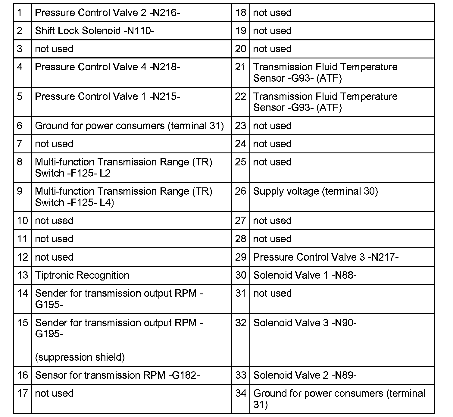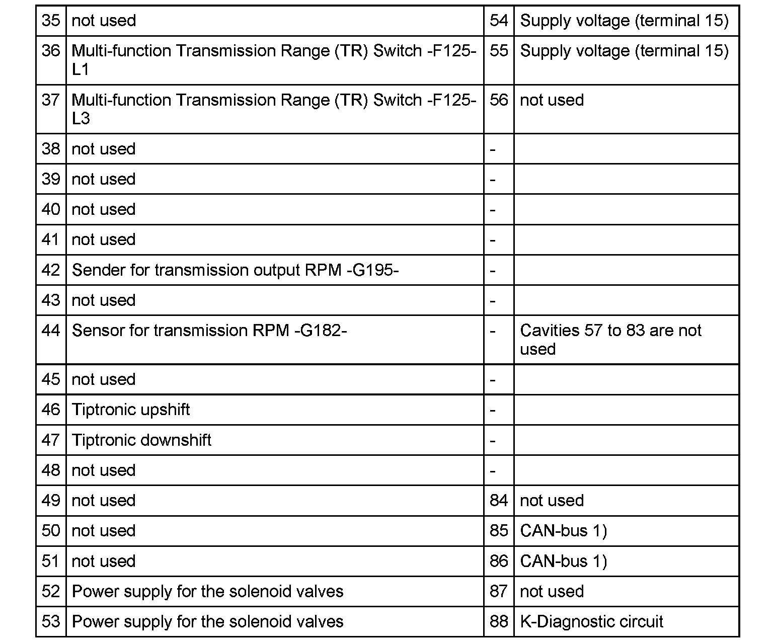 Multiple harness connector (88-pin connector) of Transmission Control Module (TCM) -J217- (cavities on V.A.G 1598/20) (Part 1):