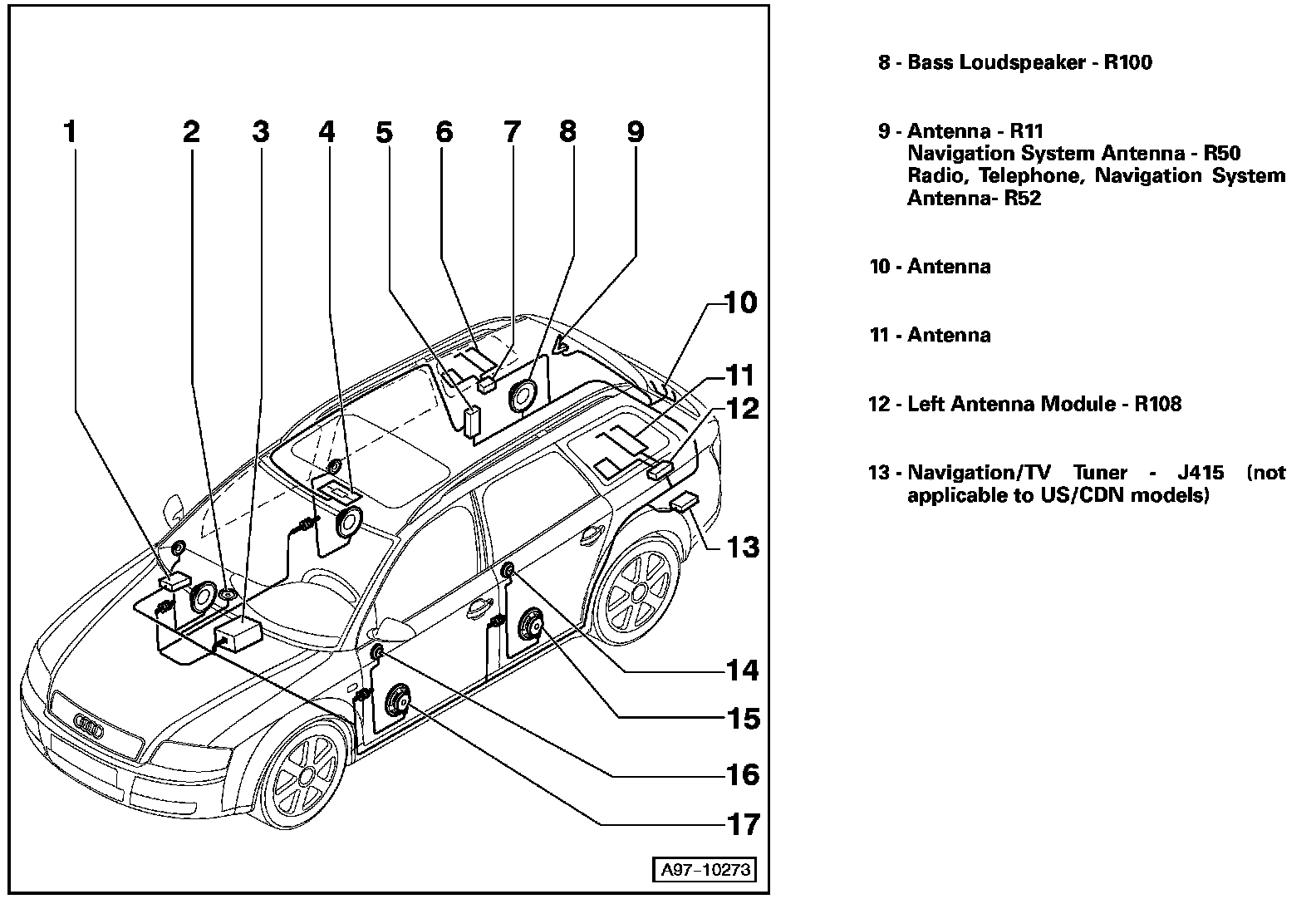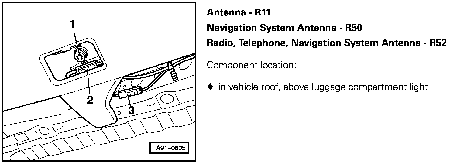 Antenna - R11, Navigation System Antenna - R50, Radio, Telephone, Navigation System Antenna - R52: