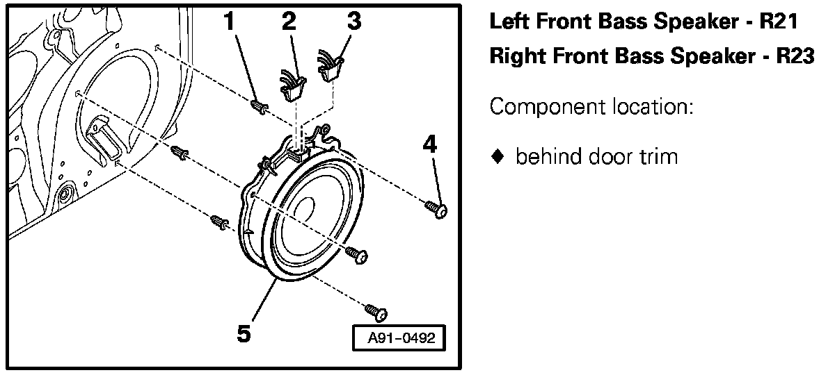 Left Front Bass Speaker - R21, Right Front Bass Speaker - R23: