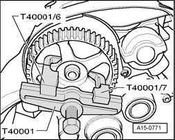 - Remove camshaft sprocket using puller T40001 and Claw T40001/6 and Claw T40001/7.