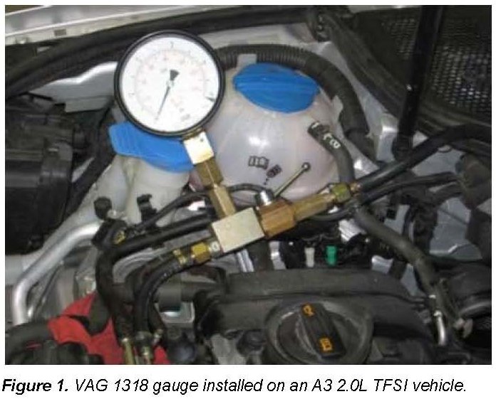 4. Measure actual low-side fuel pressure via mechanical gauge (VAG 1318) on the low pressure supply line in the engine compartment (Figure 1).