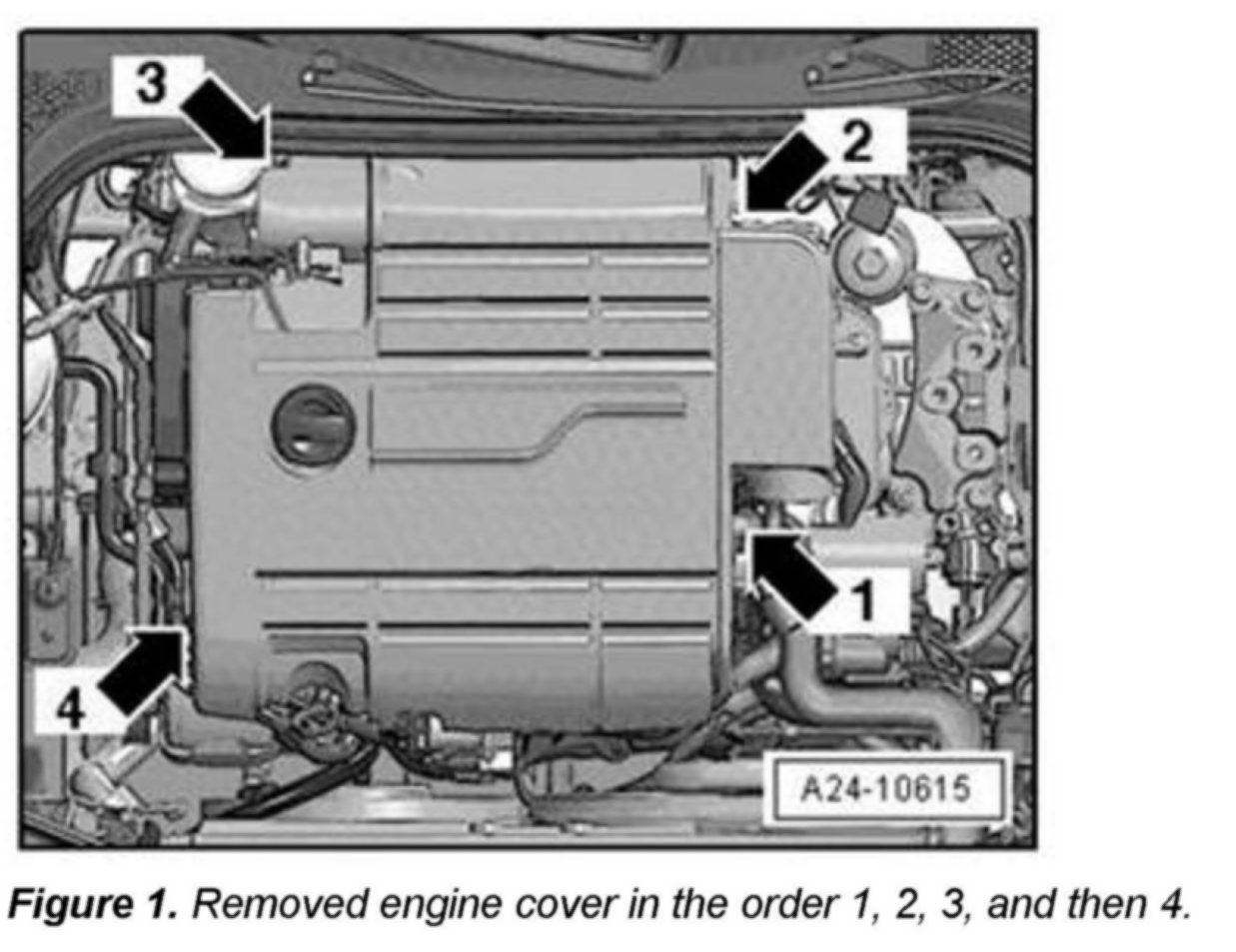 1. Carefully remove the engine cover panel in order 1 - 4, as shown in Figure 1.