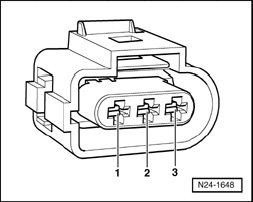 - Using the Voltage Tester VAG1527B or equivalent, check for voltage between terminal 1 and terminal 2 with the electrical harness connector connected to Camshaft Position (CMP) Sensor G40.