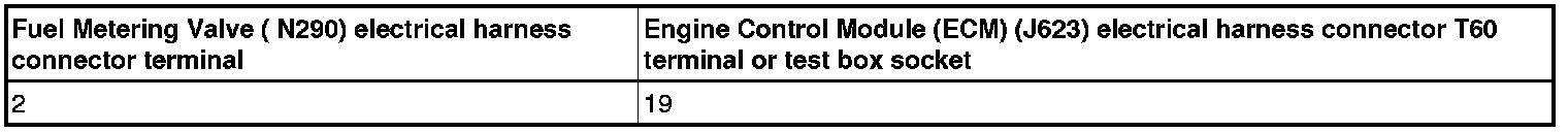 - Using a multimeter, check the Fuel Metering Valve (N290) electrical harness connector terminals to the Engine Control Module (ECM) (J623) electrical harness connector T60 terminals for resistance.