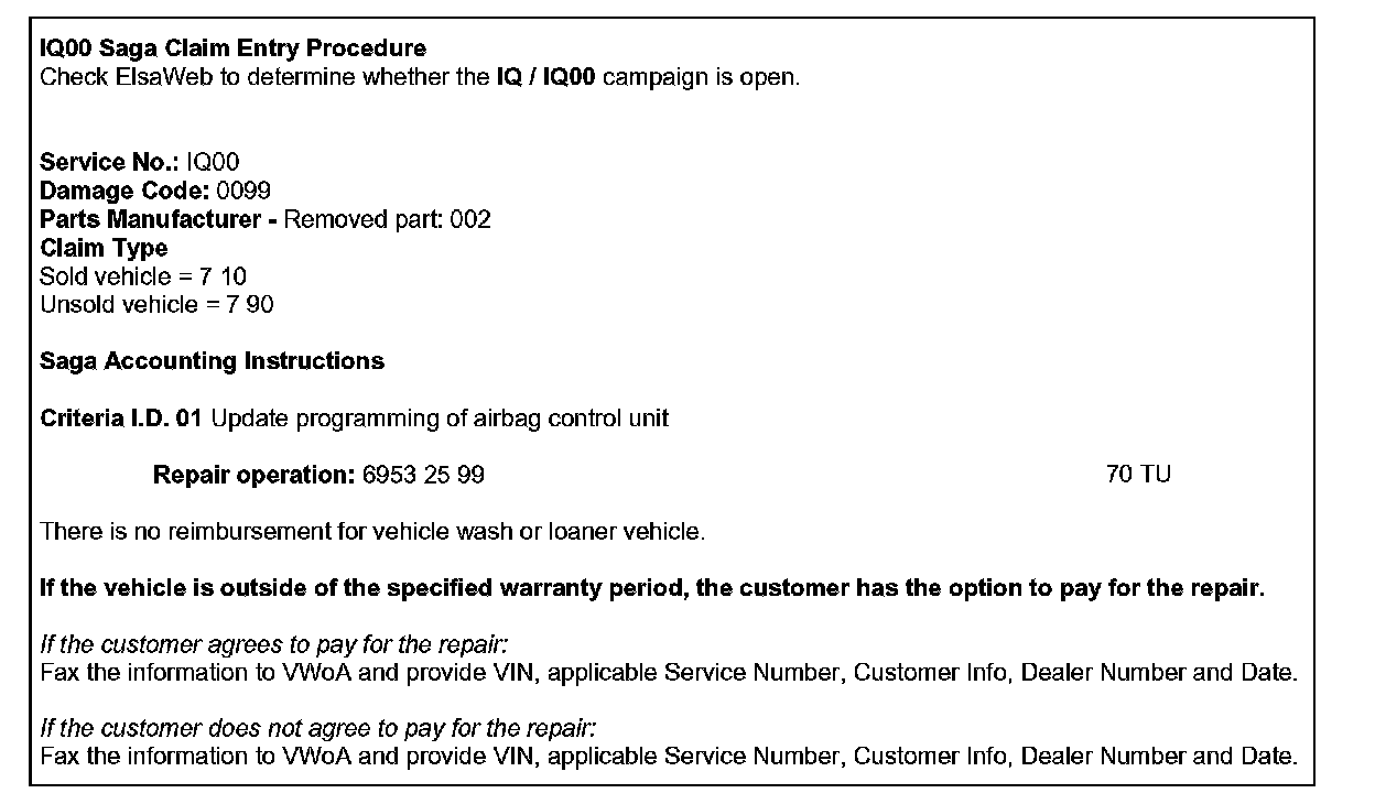 To ensure prompt and proper payment, be sure to enter, immediately upon completion of the repair work, the applicable reimbursement code listed below. Claims will only be paid for vehicles that show the IQ code in the ElsaWeb Campaign/Action Information screen on the day of repair.