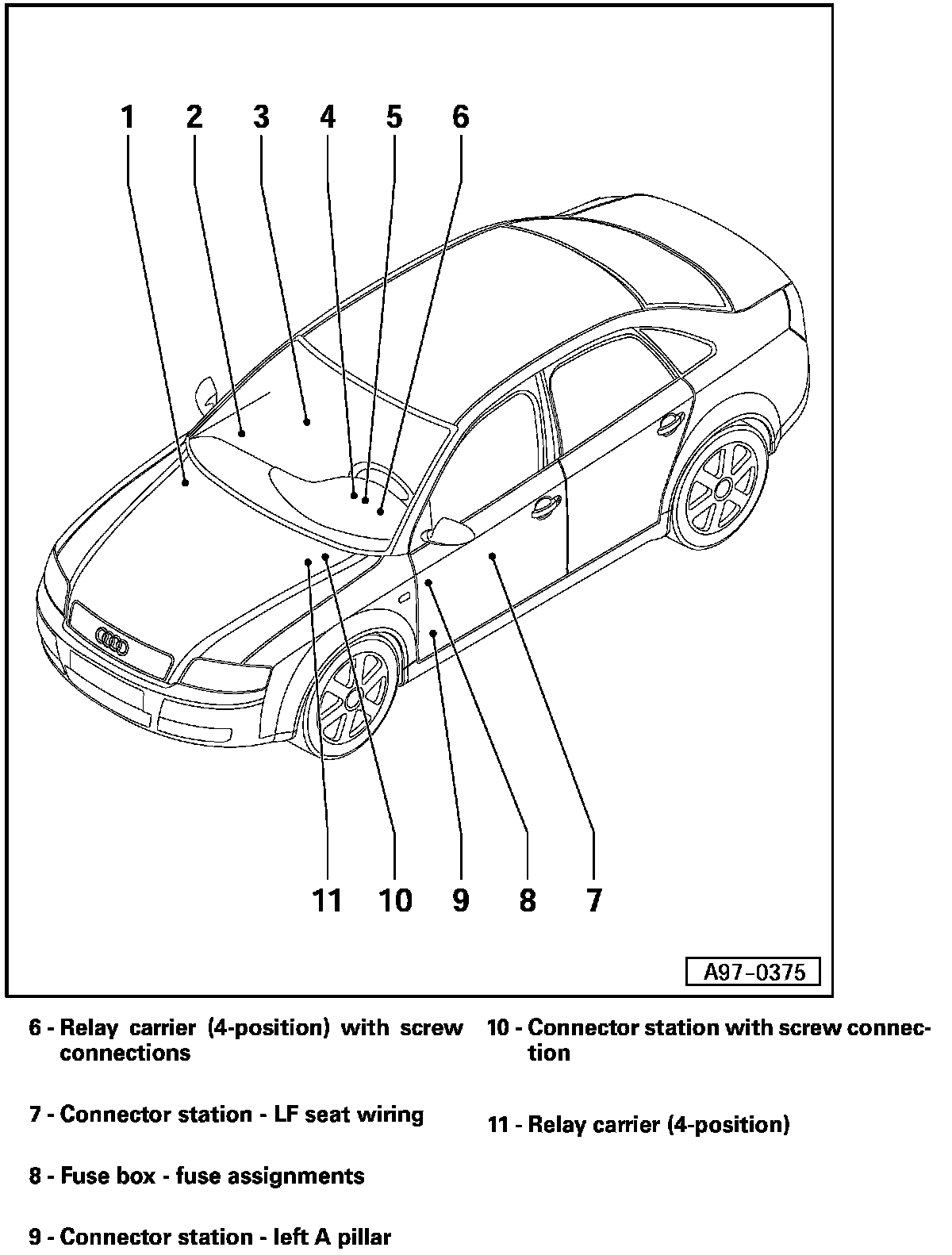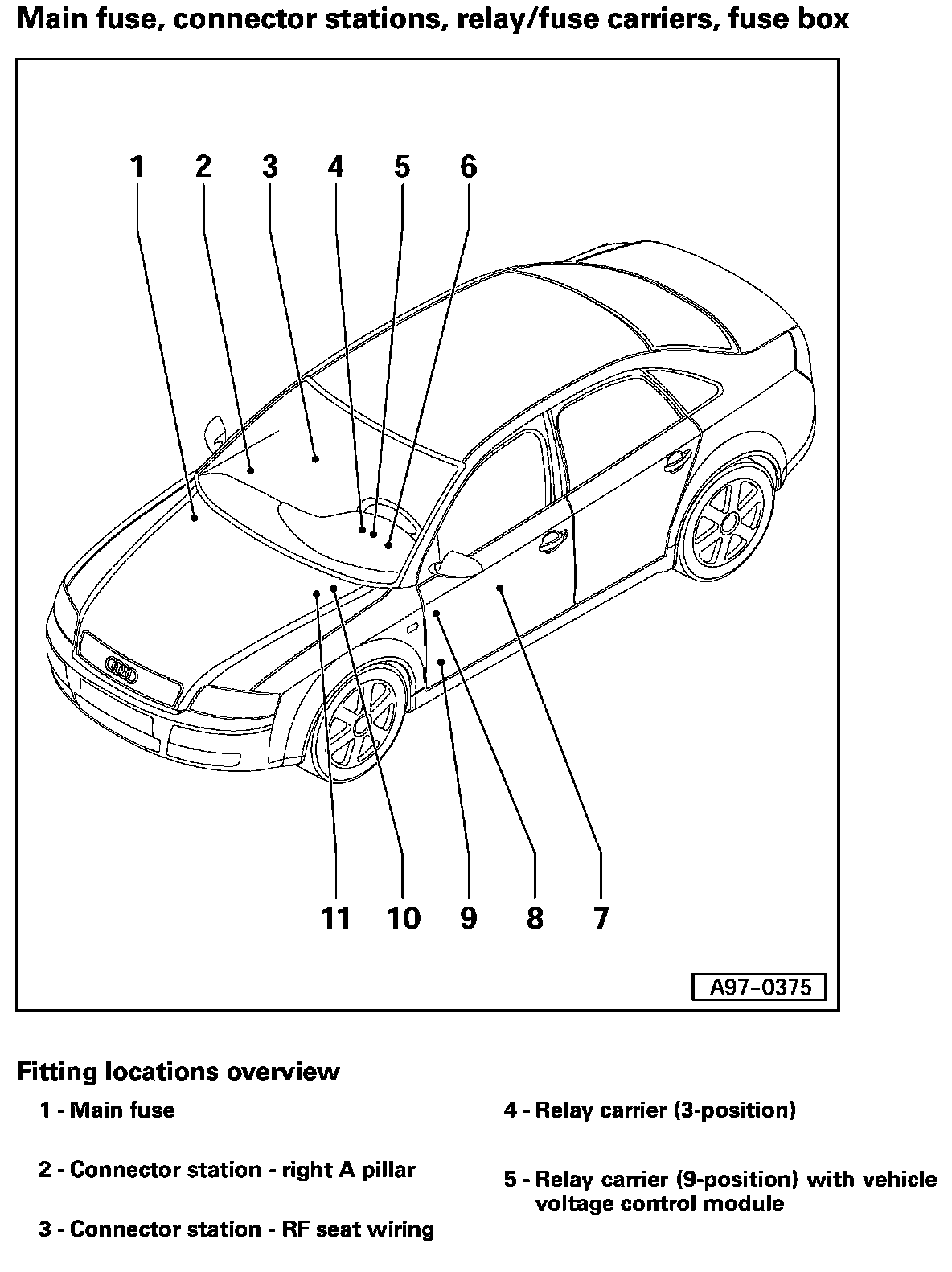 Main Fuse, Connector Stations, Relay/Fuse Carriers, Fuse Box (Part 1):
