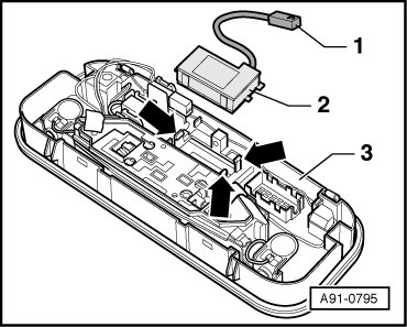 - Remove the button - 2 - from the bracket - arrows - for the interior light - 3 -.