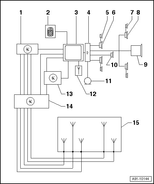 14 Antenna Selection Control Module (J515) behind roof end trim