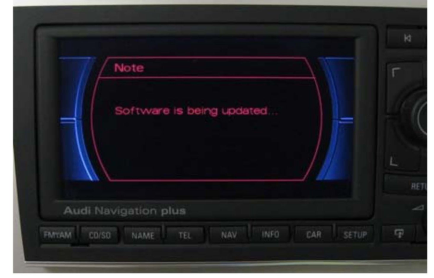 1. Obtain a Version 2007 (or newer) Navigation plus DVD from dealership inventory or another stock vehicle and insert it into the Navigation plus unit. Within approximately 30 seconds, the software update will automatically begin. After approximately 2 minutes, the first part of the software is loaded and the system will reboot.