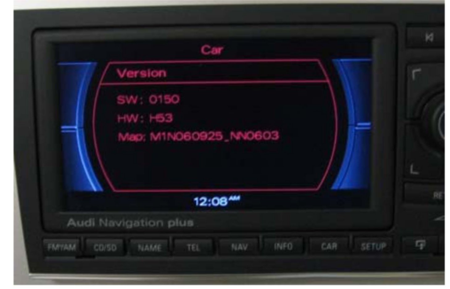 3. Once the radio is powered on, press the CAR button then select Version to verify the Software Version is 0150, or higher. Eject the DVD used for the update and reinsert the customer's original DVD into the Navigation plus drive.
