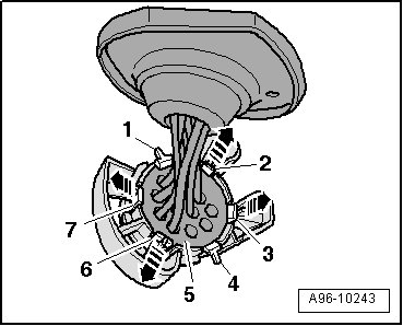 - First release securing tabs - arrows - and then retaining clips - 1, 2, 3, 4, 6, 7 -.