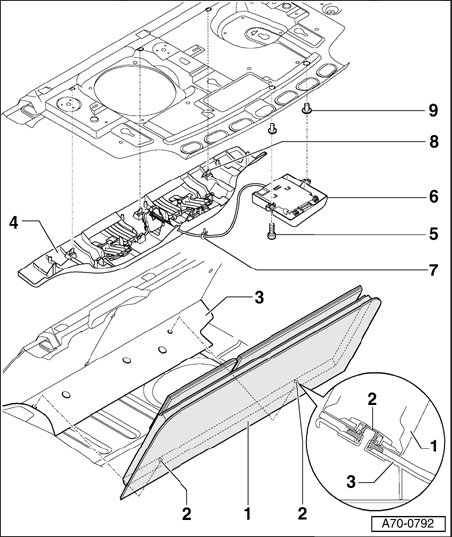 - Unclip two clips - 2 - between cargo tray - 1 - and rear panel sill - 3 -.