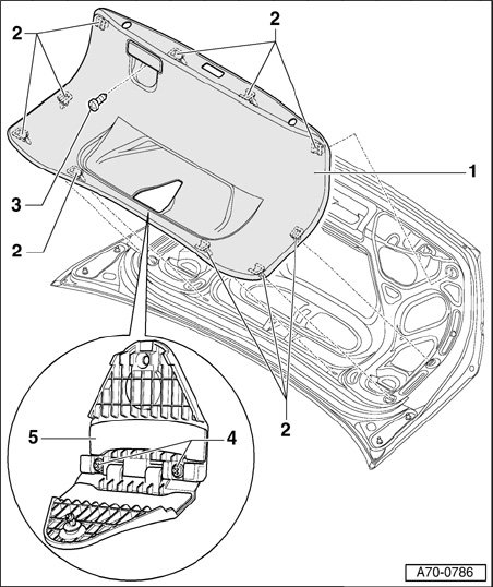 - Loosen ten clips - 2 - on rear lid trim and unclip them from below.