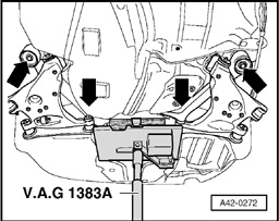 - Apply engine/transmission jack V.A.G 1383 A with universal transmission support V.A.G 1359/2 and a suitable wooden block to subframe/final drive (illustration shows vehicle with front wheel drive).