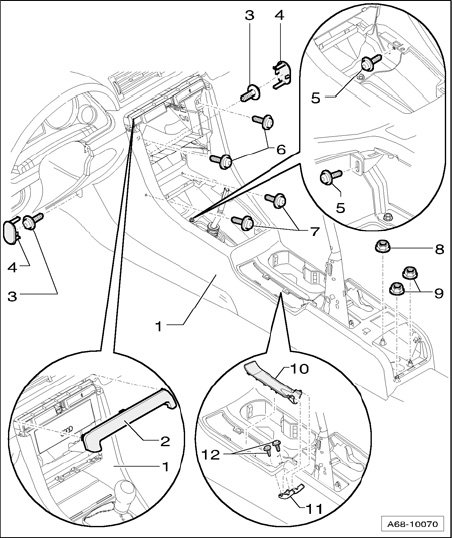 - Remove two Phillips-head screws - 12 - on connecting piece - 11 - and remove connecting piece. Otherwise, trim cannot be pulled away above parking brake lever.