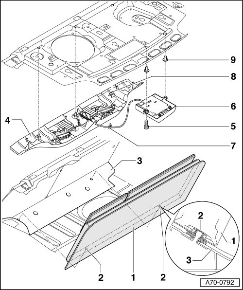 - Unclip two clips - 2 - between cargo tray - 1 - and rear panel sill - 3 -.