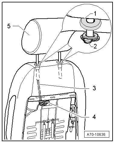 - Remove the head restraint - 5 - from the guide and carefully remove the connector wire - 3 -.