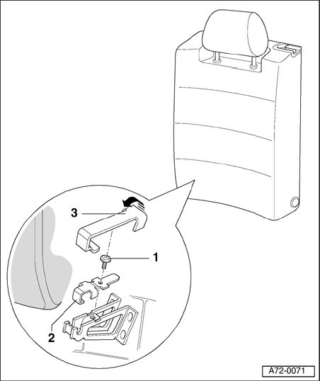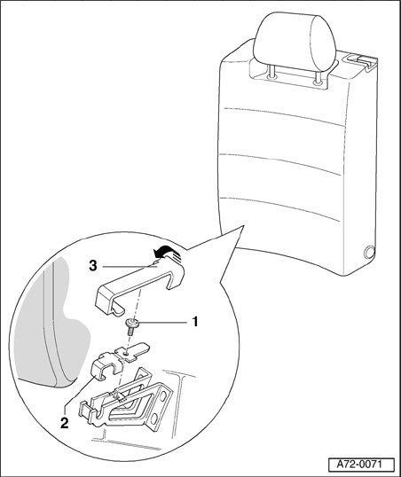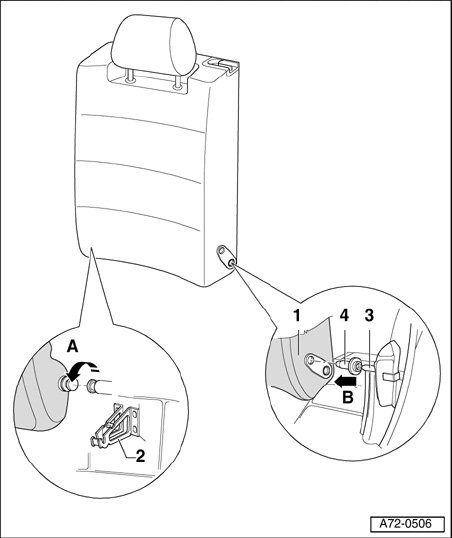 - Lift backrest - 1 - from center support - 2 - in direction of arrow - A - and detach from fitting - 3 - in - direction of arrow B -.