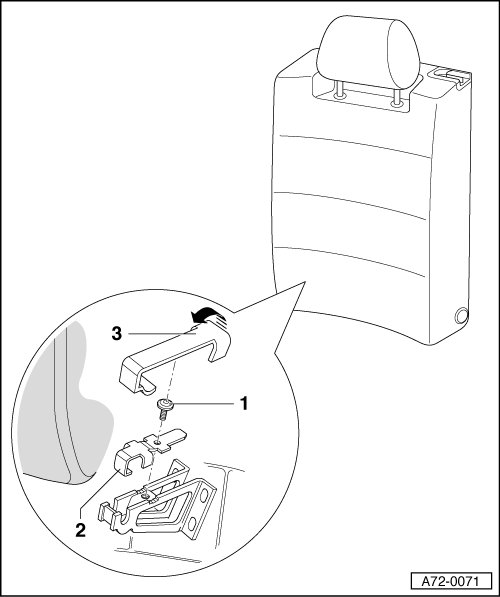 - Lift backrest - 1 - from center support - 2 - in direction of arrow - A - and detach from fitting - 3 - in direction of arrow - B -.