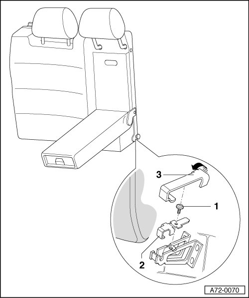 - Lift backrest - 1 - from center support - 2 - in direction of arrow - A - and detach from fitting - 3 -.