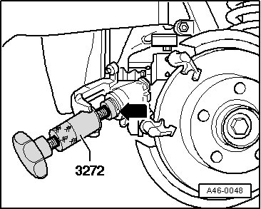 • Press the piston back into the cylinder with resetting and extracting tool (T10165), before inserting new brake pads. Extract some brake fluid from the reservoir with a bleeder bottle before pressing piston back. Otherwise brake fluid which was used to top off brake fluid reservoir, may run out and cause damage.