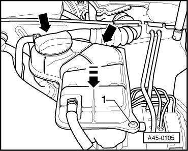 - Loosen the bolt - 1 - and pull the coolant expansion tank out in the direction of the - arrow -, then swivel the tank to one side. Tightening specification of bolts 6 Nm.