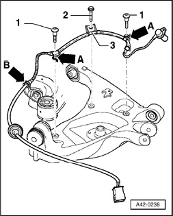 - To remove, unscrew collared bolt - 2 - and carefully detach cable guide at bolts - 1 - arrows A -.