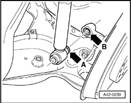 The longer collar - arrow A - on shock absorber must be seated centering on hub carrier/wheel bearing housing - arrow B -.