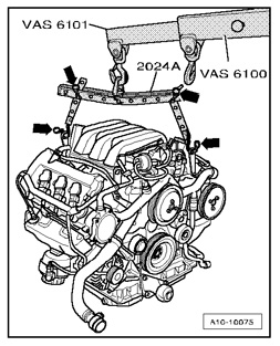 - Hook engine sling 2024 A onto engine and onto workshop crane VAS 6100 with lift arm extension for workshop crane VAS 6101 as shown in the illustration.