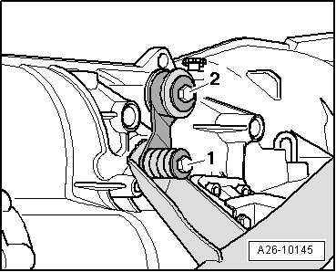 - Attach mounting elements from (VAS 6131/10) and (VAS 6131/12) at left of the engine/transmission assembly as shown in the illustration.