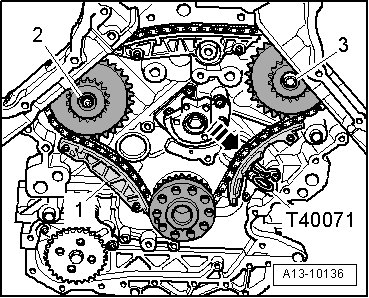 - Push drive chain tensioner guide rail in direction of - arrow - and secure chain tensioner using securing pin (T40071).