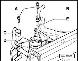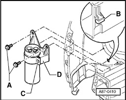 - Loosen bolt - C - and pull accumulator out of bracket - D -.