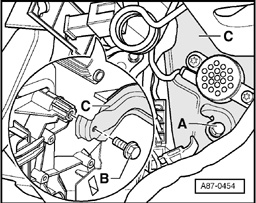 - Remove bolts - A - and - B - between support - C - and air conditioner.