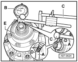 - Install measuring leads 1 2 of dial gauge - D - to flange of drive plate - A - with a pretension of approx. 1.0 mm.
