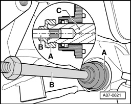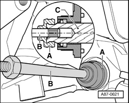 - Check drive shaft - B -. Splines must not show signs of wear and must engage snugly in splines of drive pinion - C -.