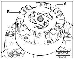 - Insert drive plate - A - with rubber elements - B - in drive plate - C - as shown until it makes contact with compressor shaft.