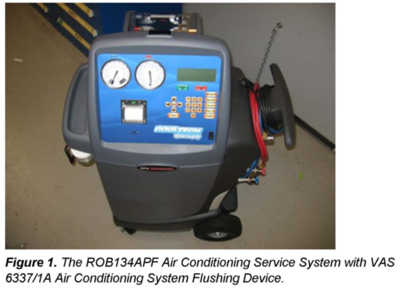 Use the ROB134APF Air Conditioning Service System with VAS 6337/1A Air Conditioning System Flushing Device for effective refrigerant handling and air conditioning circuit flushing after air conditioning component failure.