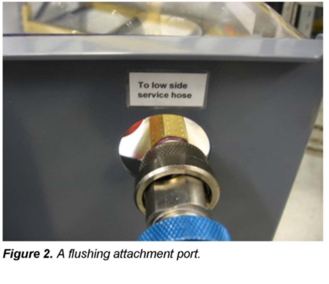 This connection strategy allows for a system flush in the opposite direction of the normal refrigerant flow.