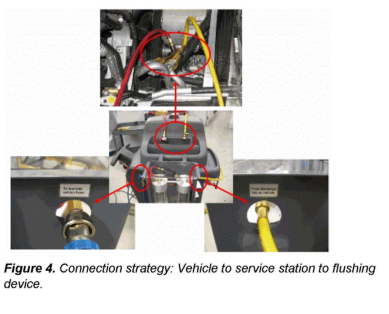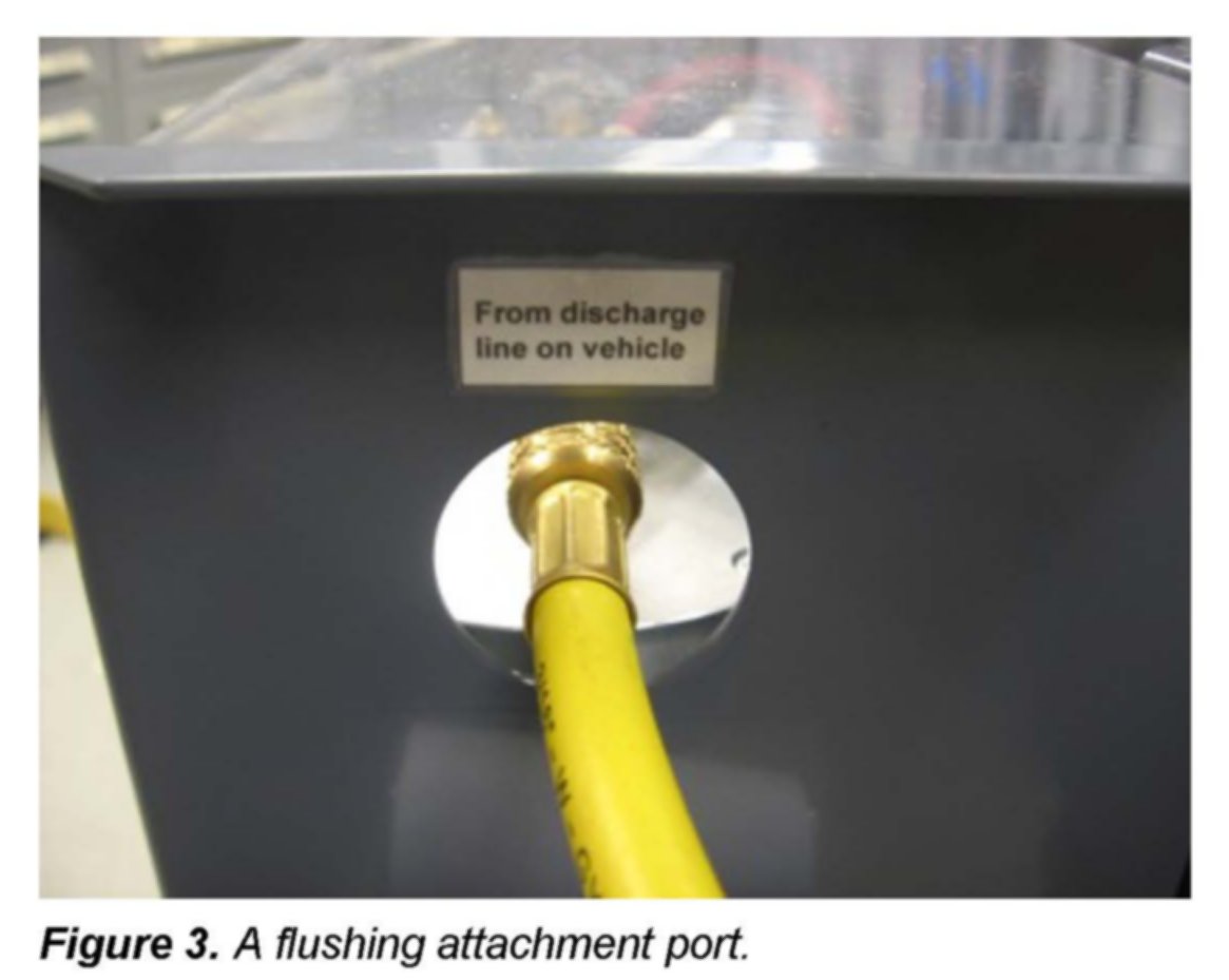 4. Once the appropriate adapters are in place, connect the service station to the vehicle through the air conditioning compressor hoses. The flushing attachment ports are labeled on the flusher.
