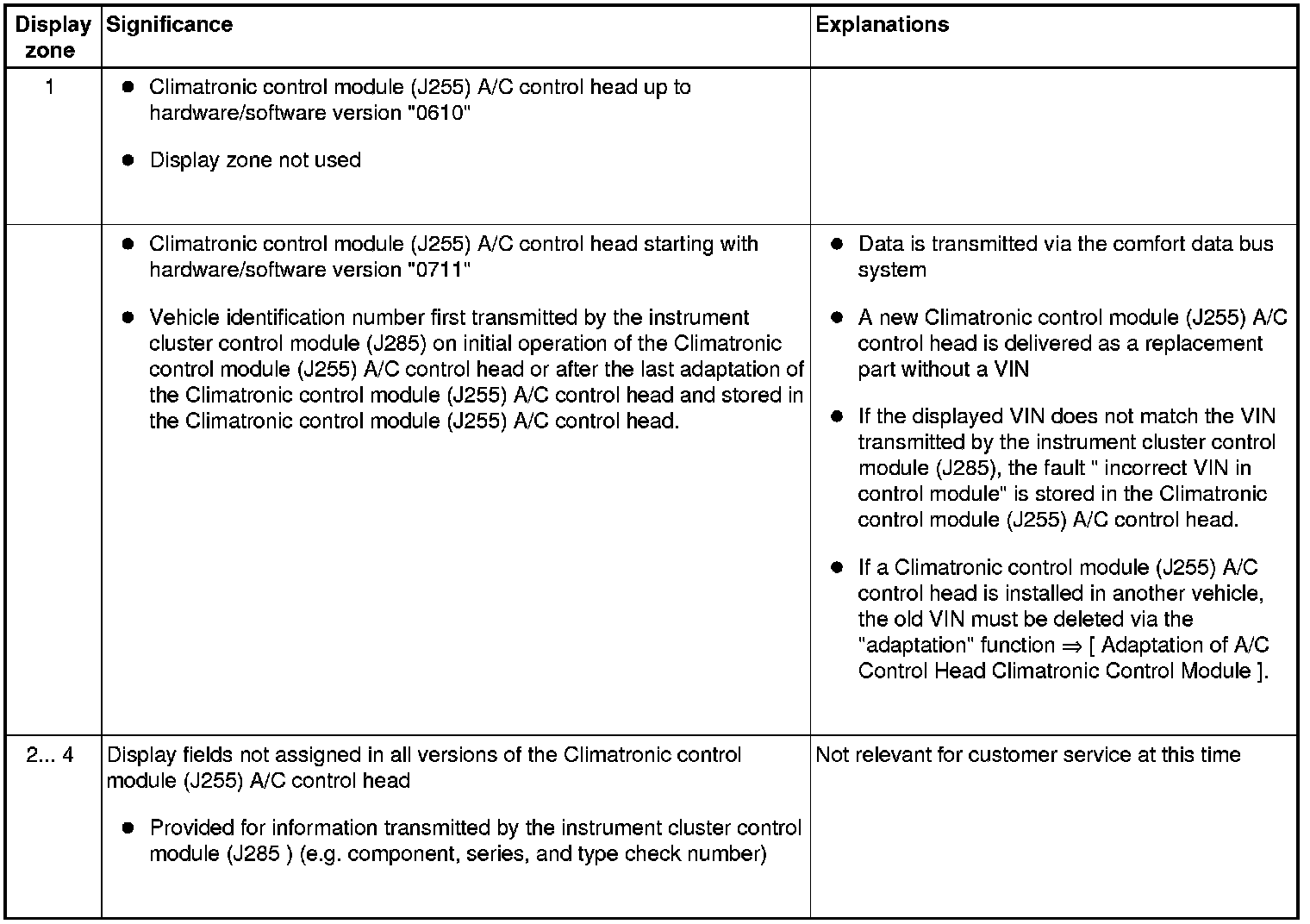 The VIN of this vehicle transmitted by the instrument cluster control module (J285) and certain information from the instrument cluster control module (J285) depending on the version of the Climatronic control module (J255) A/C control head