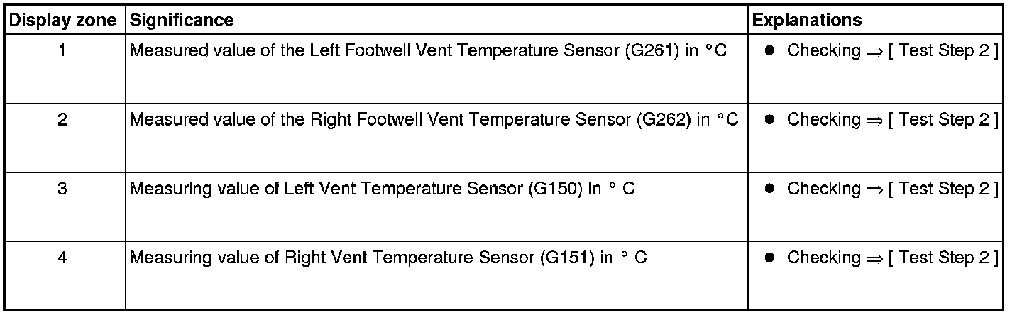 Measured values of the following sensors (left footwell vent temperature sensor (G261), right footwell vent temperature sensor (G262), left vent temperature sensor (G150) and right vent temperature sensor (G151))