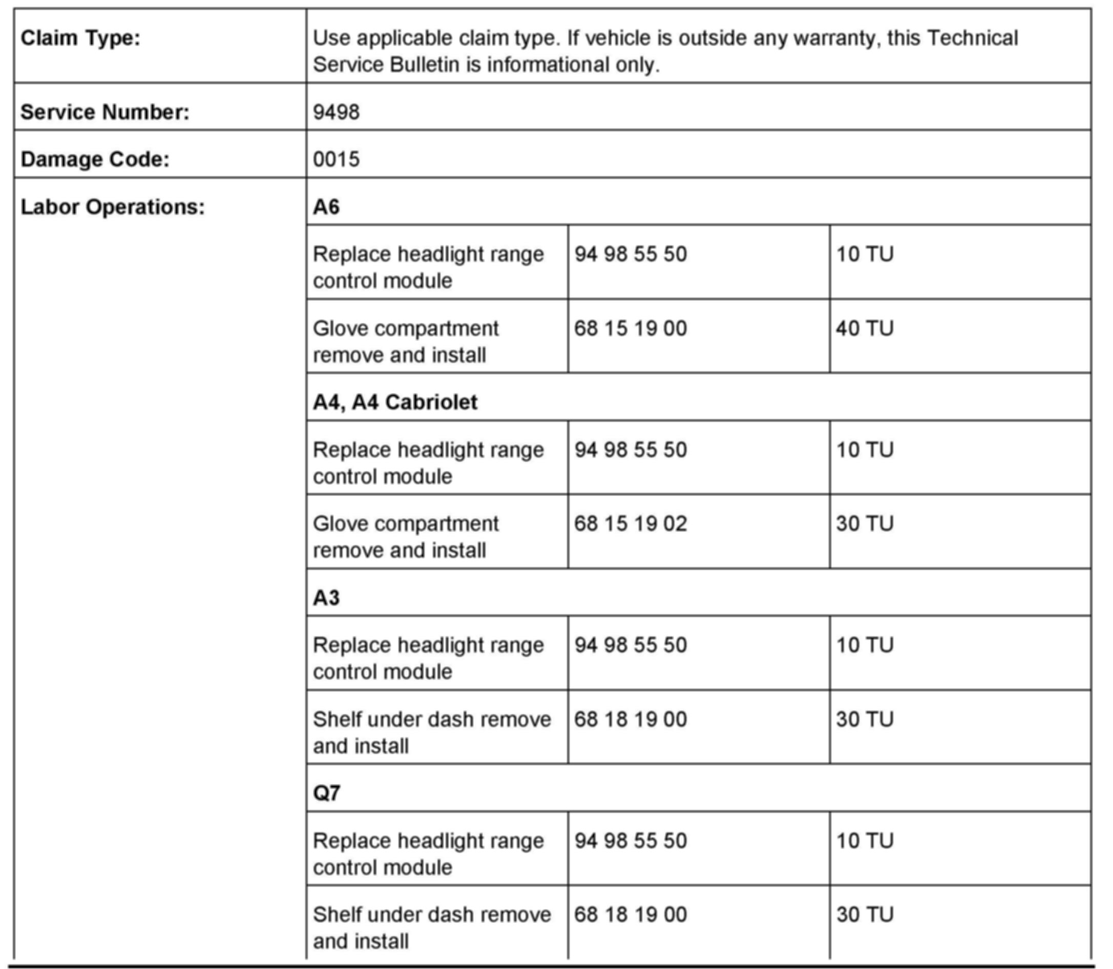 ^ "Dynamic headlight control defective" warning light (amber) comes on sporadically in the instrument cluster center display.