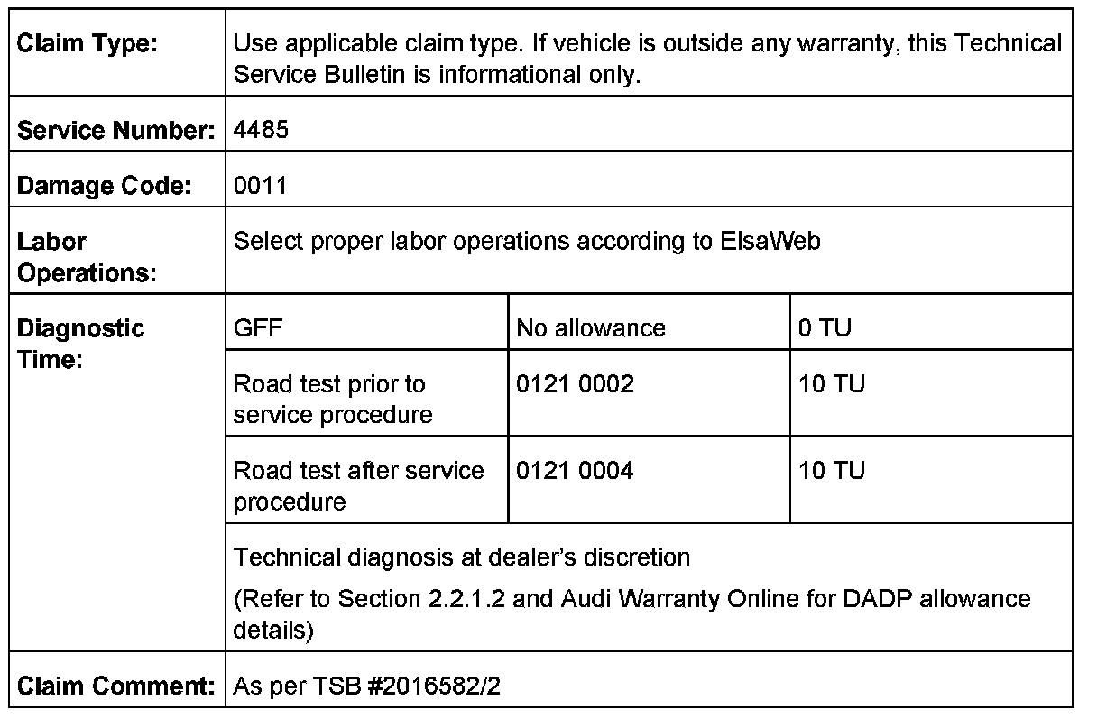 All warranty claims submitted for payment must be in accordance with the Audi Warranty Policies and Procedures Manual. Claims are subject to review or audit by Audi Warranty.