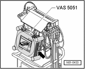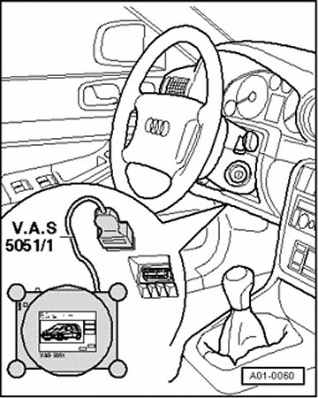 - Connect tester VAS5051 to Data Link Connector (DLC) using diagnostic cable VAS5051/1 with ignition switched off.