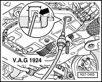 - Fill with ATF using ATF filler tool VAG1924 until ATF exits from the check hole.