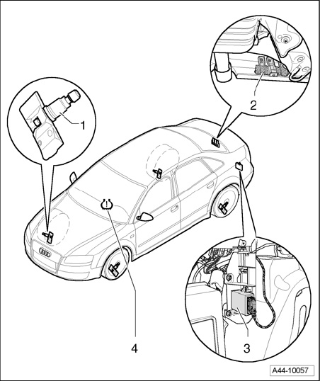 1 - Tire pressure sensor, Left Front Tire Pressure Monitoring Sensor G222, Right Front Tire Pressure Monitoring Sensor G223, Left Rear Tire Pressure Monitoring Sensor G224 and Right Rear Tire Pressure Monitoring Sensor G225