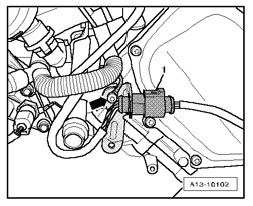 - Disconnect the 6 pin electrical harness connector - 1 - for Fuel Injectors N30, N31, N32 from the right rear of the engine.