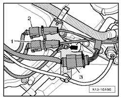 - Disconnect the 14 pin electrical harness connector - 3 - for Fuel Injectors N33, N83, N84 from the left rear of the engine.
