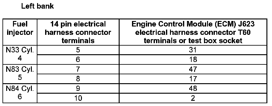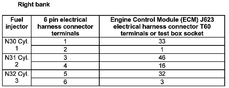 - Using a Multimeter, check the Fuel Injector electrical harness connector terminals to the Engine Control Module (ECM) J623 electrical harness connector T60 terminals for an open circuit.