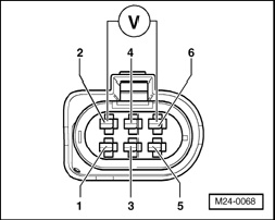- Using a Multimeter, check the Throttle Drive (for Electronic Power Control (EPC)) G186 at the Throttle Valve Control Module J338 electrical harness connector terminals 2 to 6 for voltage.
